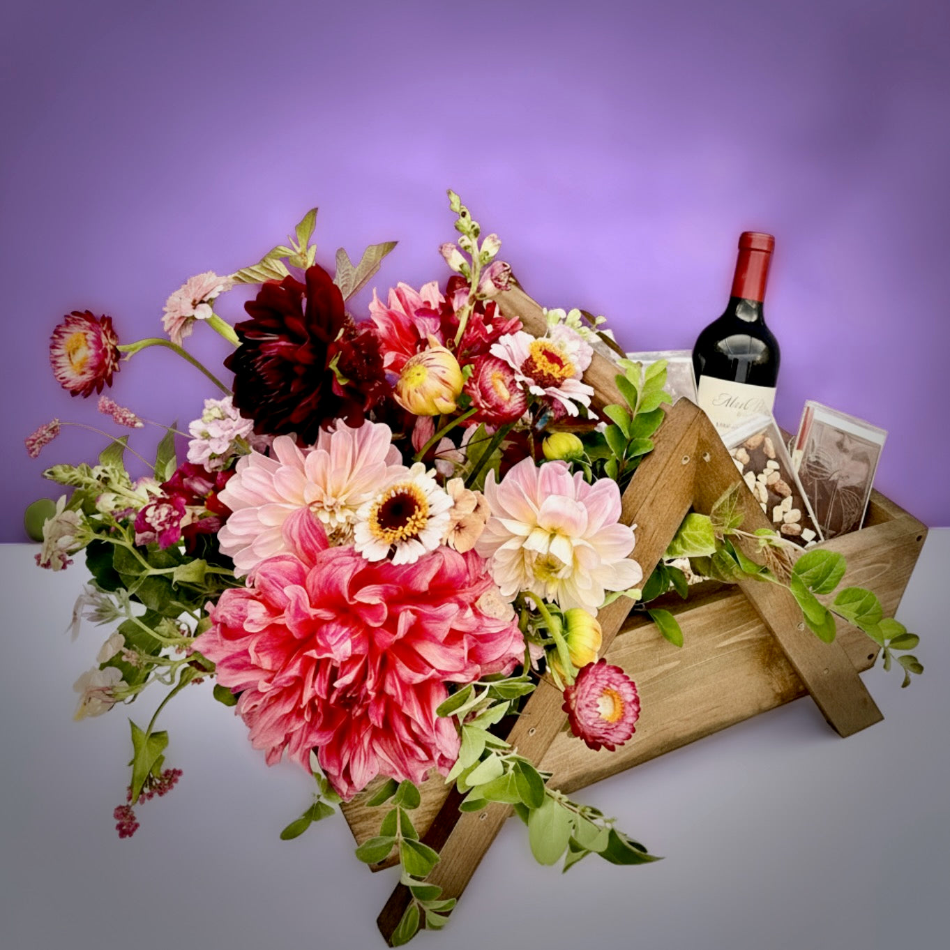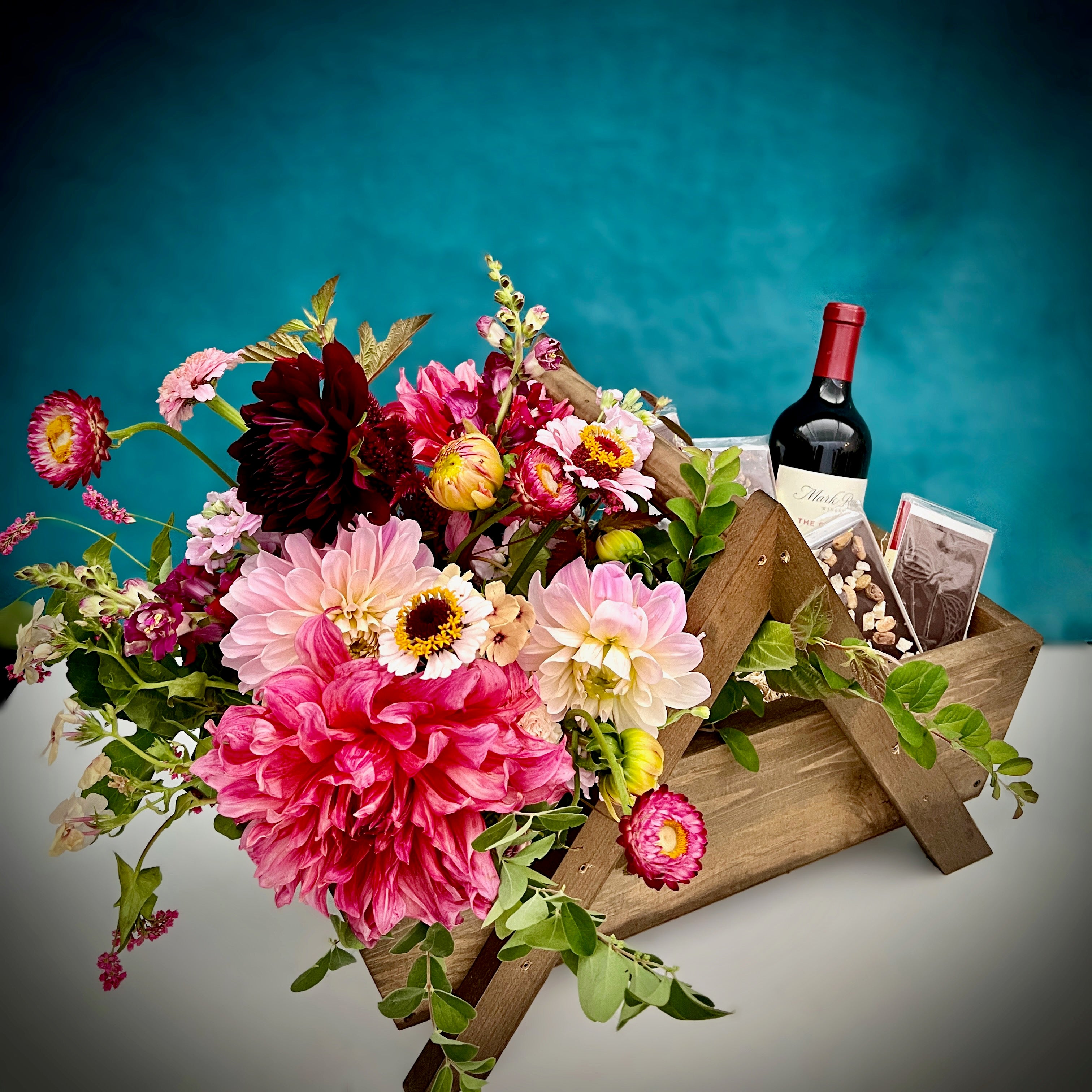 A luxurious basket of premium chocolate bars from our collection of makers and wine from Mark Ryan winery. Choose your favorite bottle and indulge in five beautiful and artistic bars of chocolate. We'll choose from our favorites of the current selection but feel free to send us a note if you'd like a certain flavor included and we're happy to accommodate if it is available.