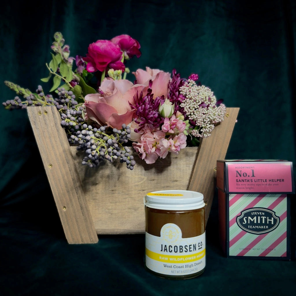 Send this Christmas themed Tea & Honey gift basket to the tea lover in your life! The perfect Christmas gift featuring a jar of Jacobsen honey and Smith Teamaker 'Santa's Little Helper' tea sampler.