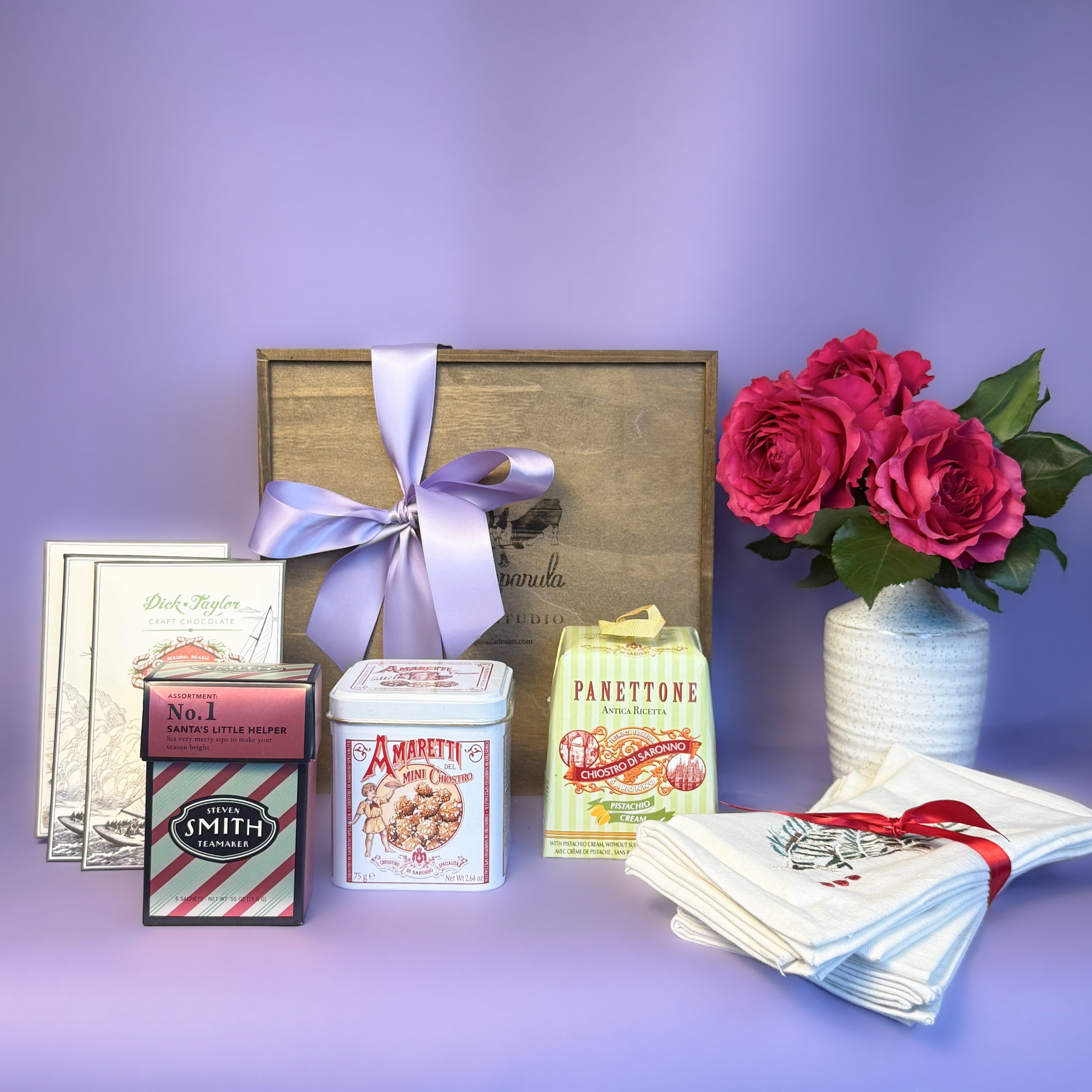 A thoughtfully curated holiday gift box, ready for shipping to the very nicest on Santa’s list. Filled with small indulgences and big seasonal charm, this cheerful assortment brings together classic Italian sweets, cozy tea, and craft chocolate—finished with a festive flourish.