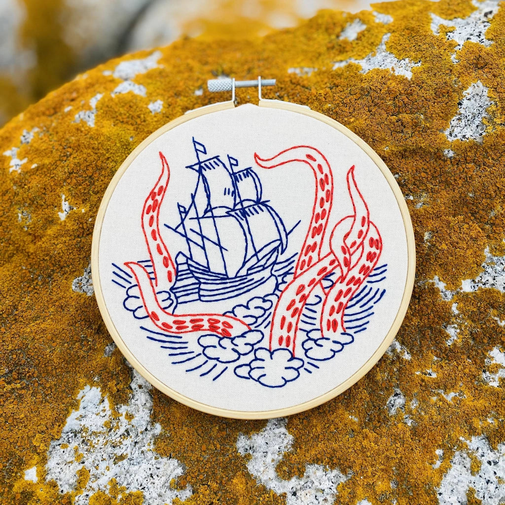 Craft kit includes: pre-printed pattern on unbleached cotton fabric 15cm (6”) embroidery hoop embroidery floss (2 full skeins) BOHIN size 3 embroidery needle instructions in ENGLISH and FRENCH First time beginner friendly. Approximate package dimensions: 8 3/4” x 8” x 3/8” 22cm x 20cm x 1cm Welcome to our new packaging! It's a medium weight boxboard envelope with a convenient built-in hang tab (we're plastic free!). Bilingual English and French.