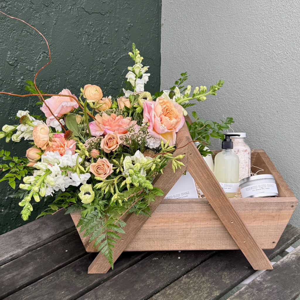 A spa basket for those who love citrusy scents! Featuring spa products made by local company handmade. la conner and designed in our handmade wooden signature gift basket, this gift includes: