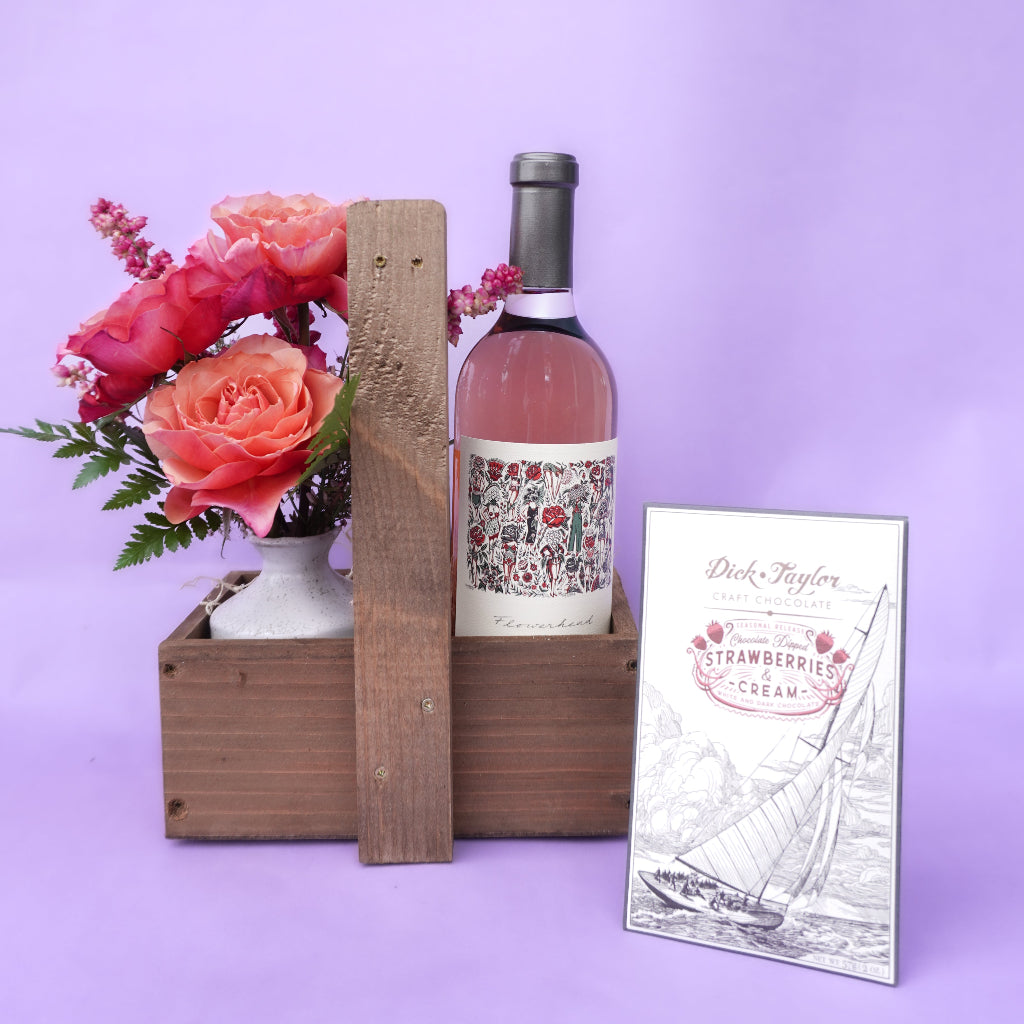 Wine, roses, chocolate—no notes. A classic trio, thoughtfully reimagined for Valentine’s Day. This custom gift basket pairs a hand-selected bottle of wine with a petite bud vase of premium garden roses and a bar of fine bean-to-bar chocolate—a simple, elegant way to say I love you.