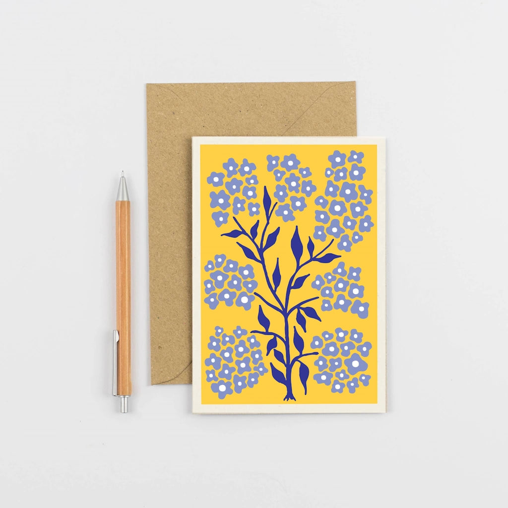 This greeting card features a "Forget-Me-Not" floral design. No message inside, making it suitable to give for many an occasion. Printed on a tactile, thick board in soft white. - Sealed using card clasp sticker Size - A6 Material - 300gsm sustainably sourced card in soft white - Recycled Kraft envelope Process - Digitally printed Packaging - Card clasp sticker Origin - Printed and finished in England Sustainably.