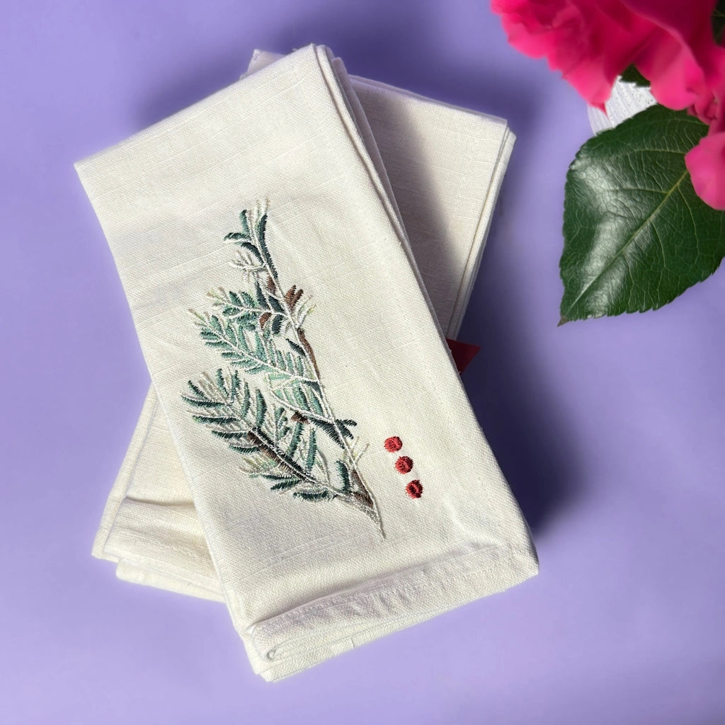 This set of four stunning white linen Alpine Napkins features delicate embroidered greenery & holly berry details & adds a festive, wintry touch to the dinner table during the holidays.