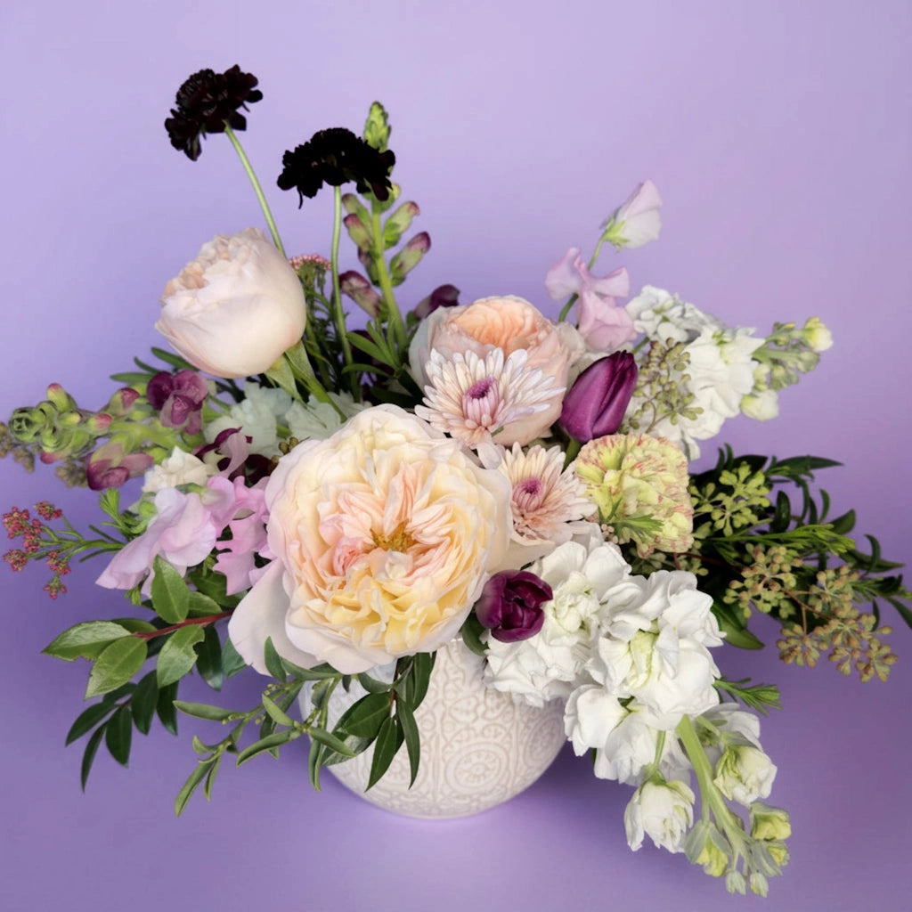 A gorgeous combination of creamy whites and pinks combined with sultry purples and pops of lavender designed in a ceramic vase.
