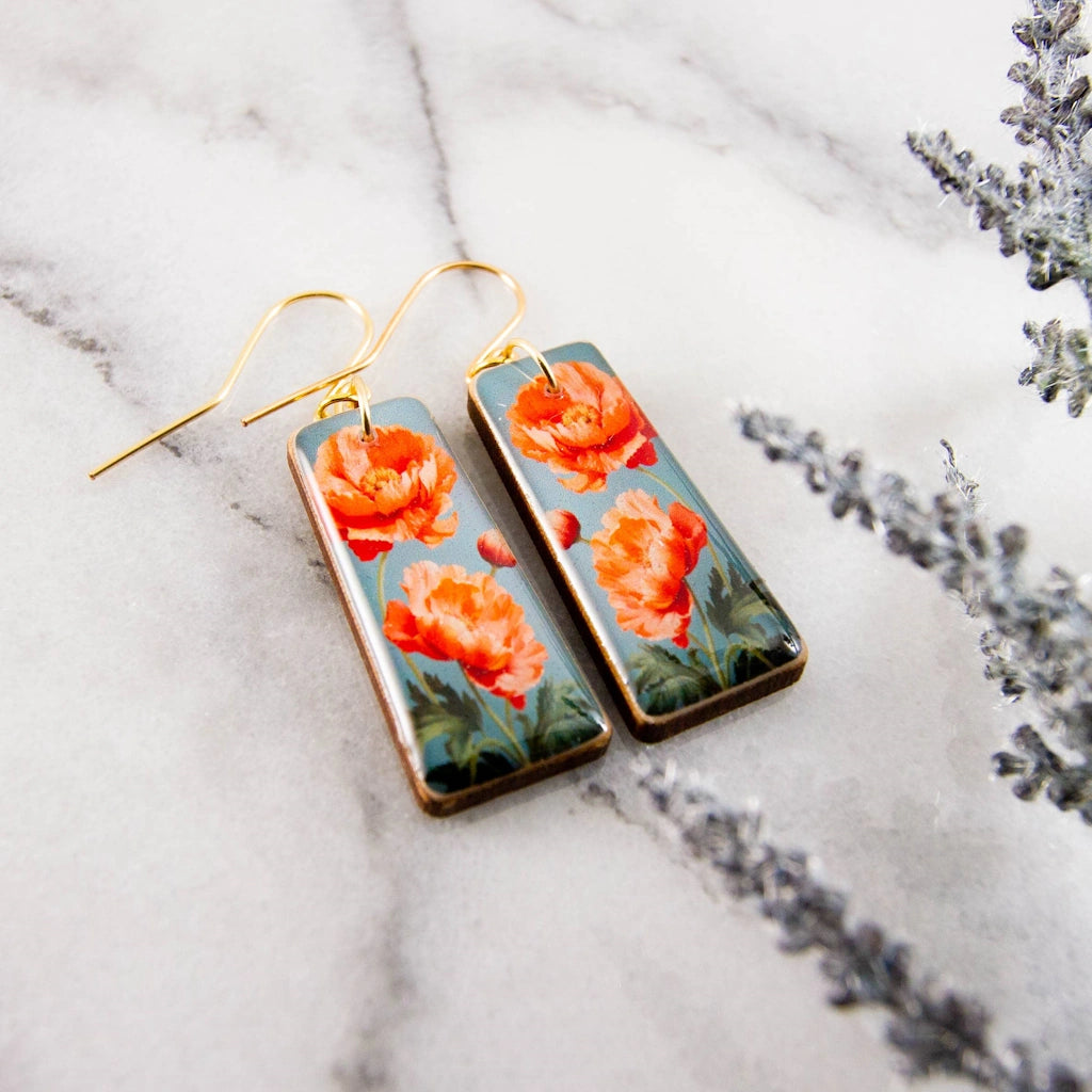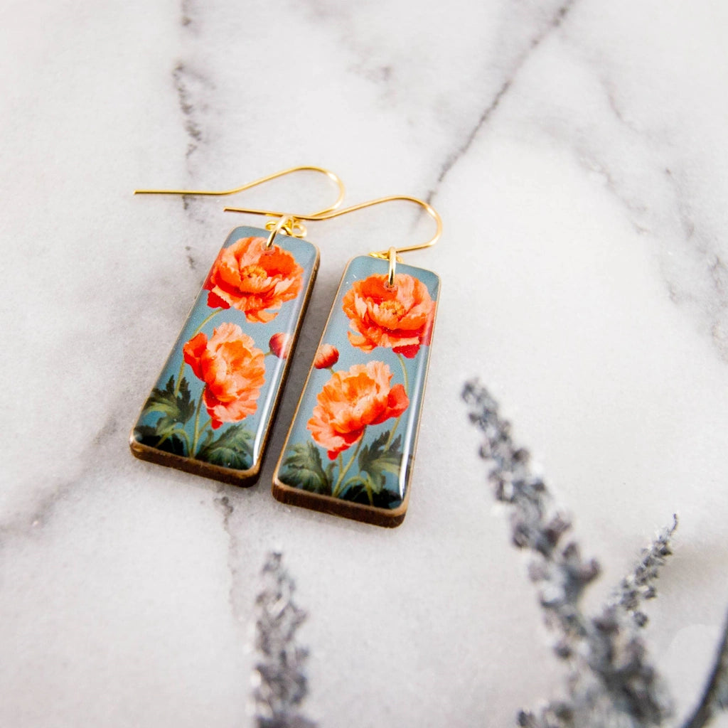 These bold earrings are the perfect summer accessory! Featuring a classic poppy illustration, rendered in shades of orange and grey.