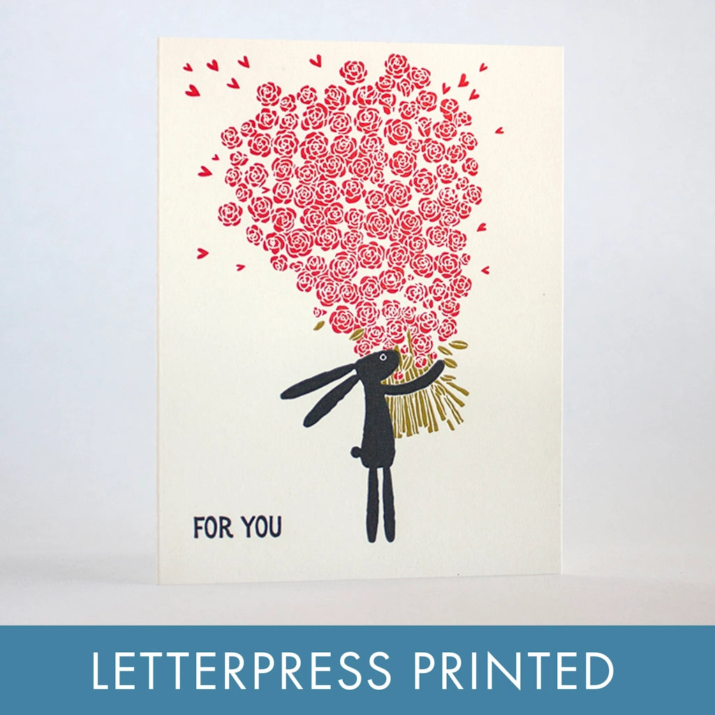"For you" All about this card: -Comes with a kraft envelope. -Dimensions: A2 (4.25 x 5.5 inches). -Designed by Fugu Fugu Press in Pasadena, CA. Letterpress printed by hand in Portland, Oregon. Available from Campanula Design Studio, Seattle florist and gift basket company in Magnolia.