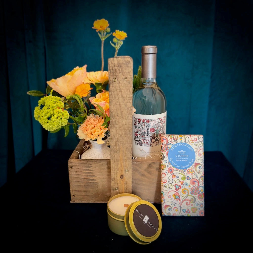 Cheers, Mom! This is the perfect package for Mother's Day! A small bud vase, a bottle of her favorite wine from our selection of Mark Ryan Winery bottles, a bar of our award winning Utopick chocolate, and a small tin candle by Seattle maker Summit & Terrace.