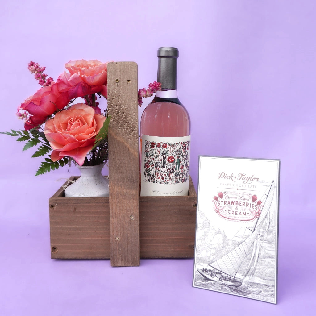 Wine, roses, chocolate—no notes. A classic trio, thoughtfully reimagined for Valentine’s Day. This custom gift basket pairs a hand-selected bottle of wine with a petite bud vase of premium garden roses and a bar of fine bean-to-bar chocolate—a simple, elegant way to say I love you.