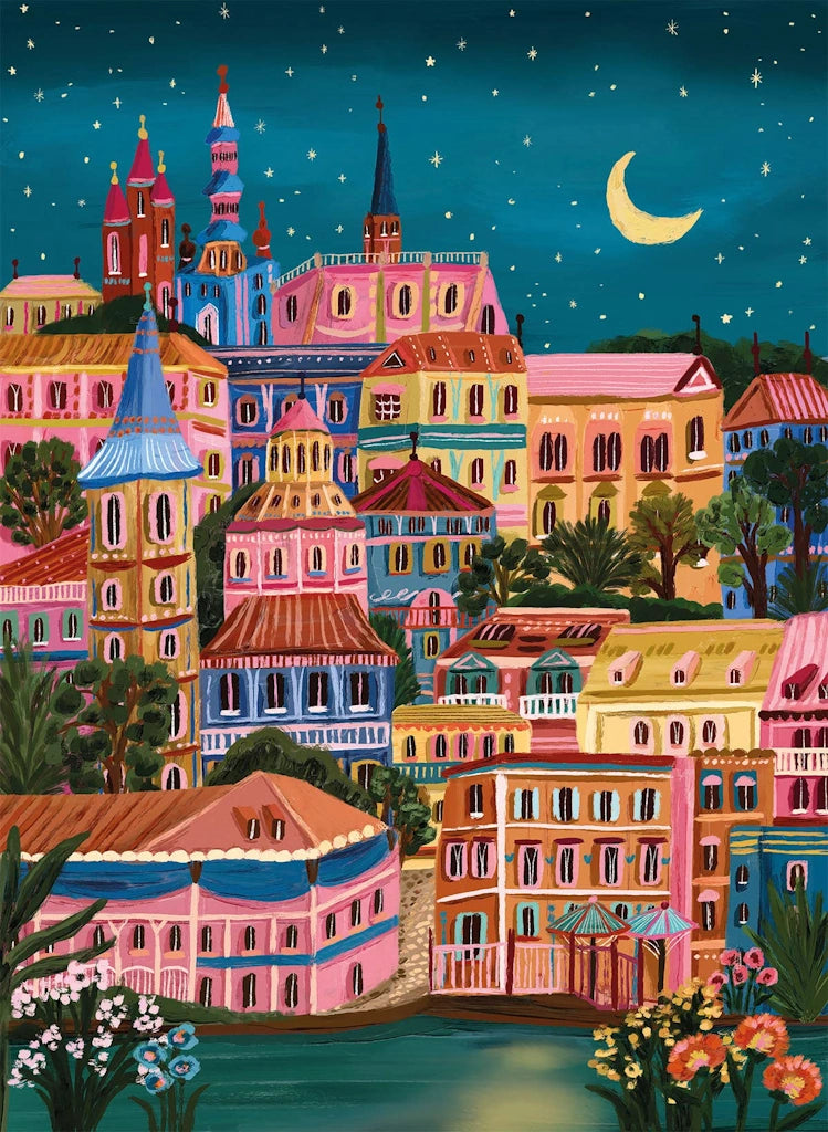 Immerse yourself in the enchanting beauty of Prague with this 1000 piece random cut puzzle featuring the mesmerizing artwork of Millie Putland. Evening in Prague captures the dreamy essence of Prague at dusk, where colorful buildings line the streets under a starry sky. A gentle crescent moon glows above, casting a soft light over the scene, while vibrant flowers and lush trees add to the charm of this magical cityscape.
