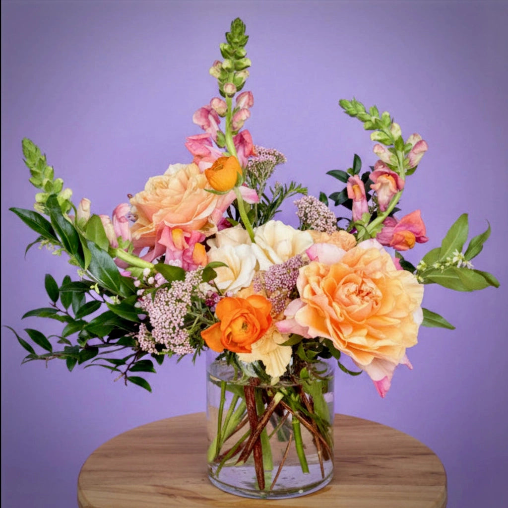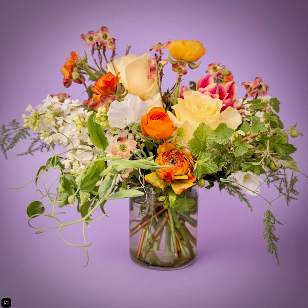 Campanula's "Orangerie" floral arrangement is a delightful composition that showcases a warm and cheery palette using seasonally available blooms.