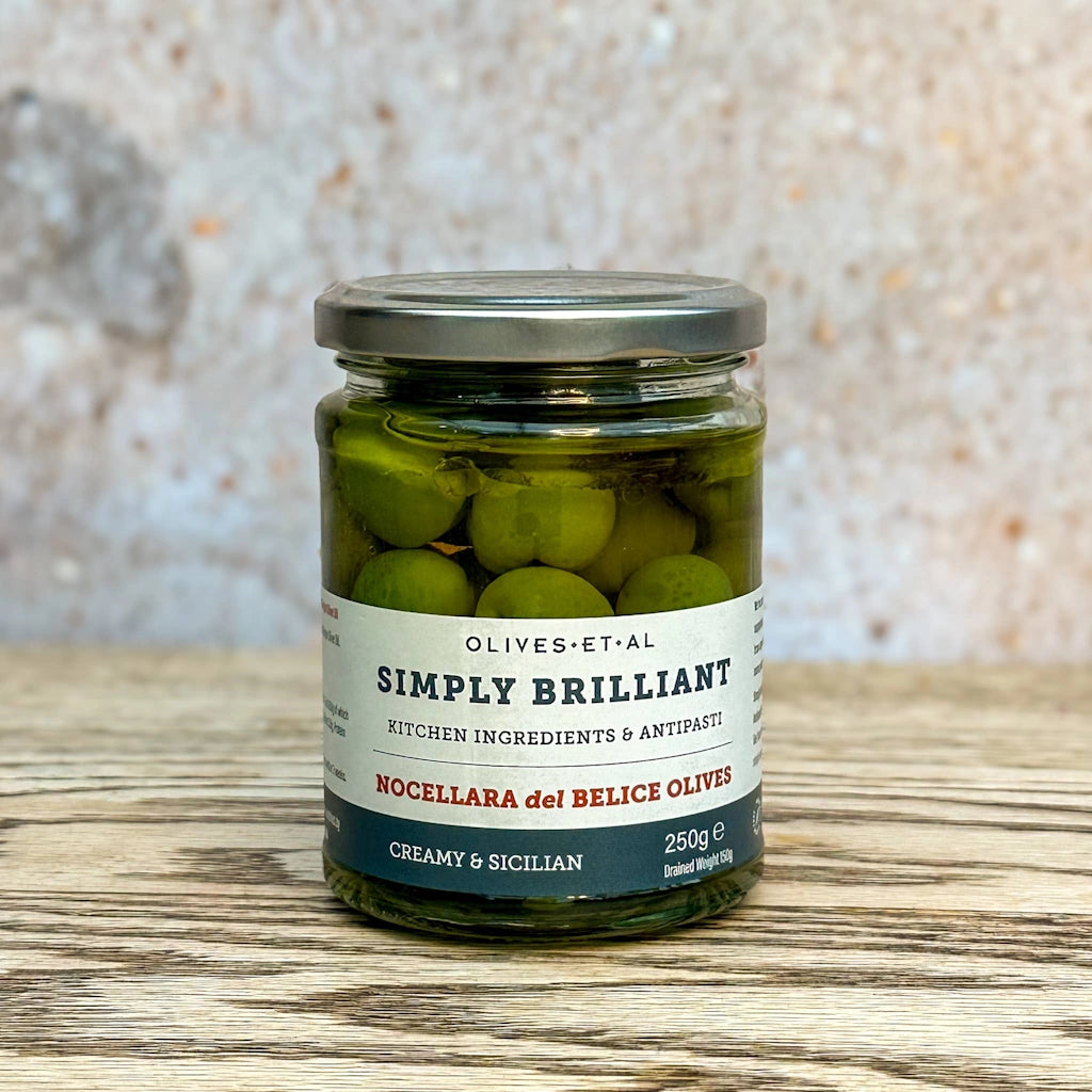 Sicilian Nocellara del Belice Olives in a light brine. Buttery, creamy & sweetly firm, these are the classic Sicilian Olives — perfect to eat just as they are, in a crisp salad, or in a Martini.