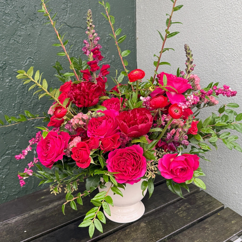 Simply red and simply beautiful. Monochromatic reds and hot pinks combined with lush greens in a ceramic vase.