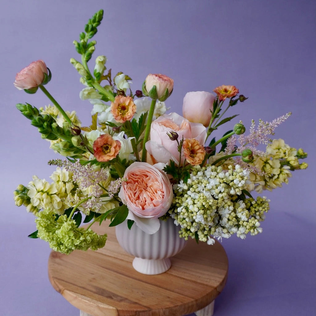 A garden inspired table centerpiece. You choose the color palette and we'll choose the best blooms of the season, always sourcing locally when available.