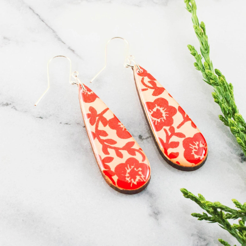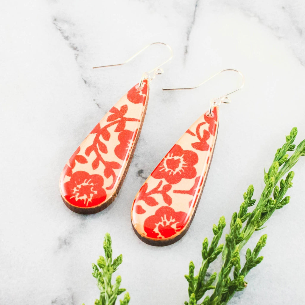 Handcrafted from sustainably harvested maple wood, handmade papers sourced from Europe, glossy, vegetable-based resin, and handcrafted sterling silver ear wires.