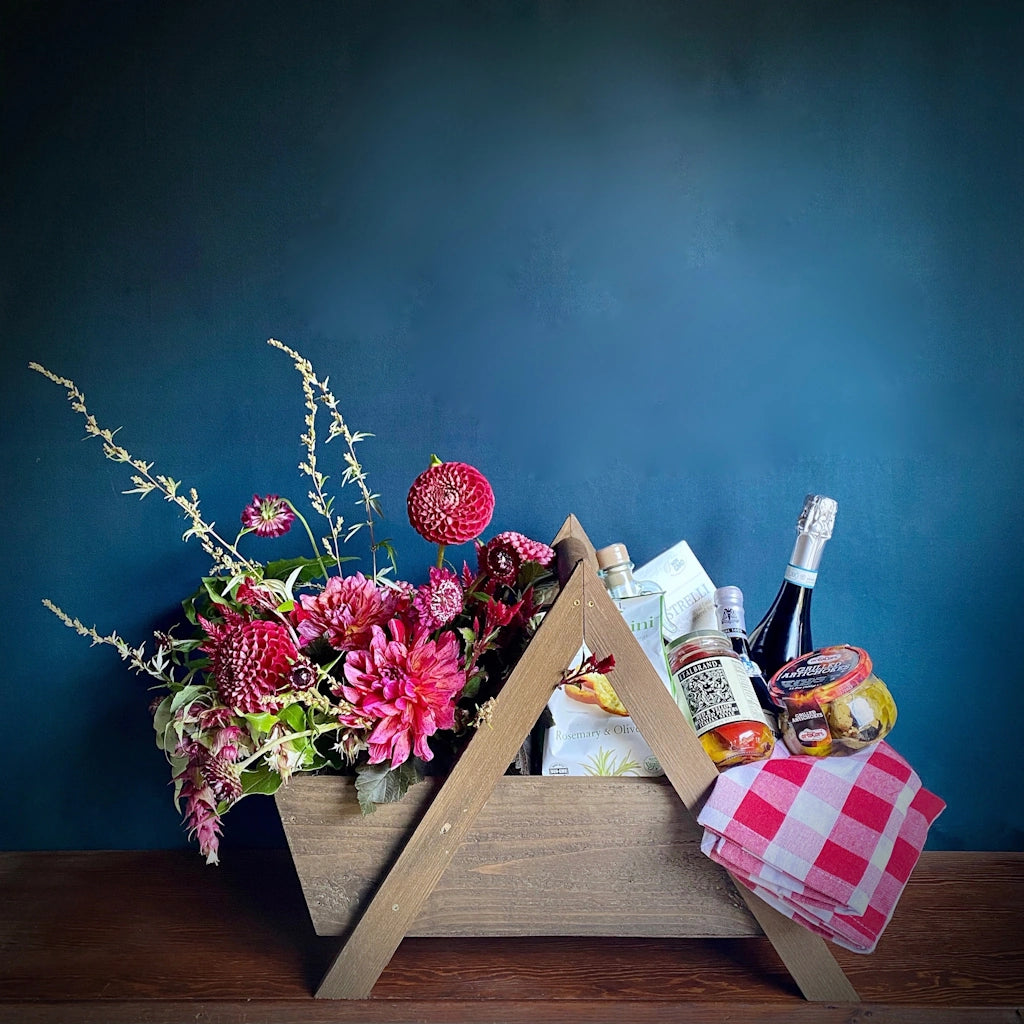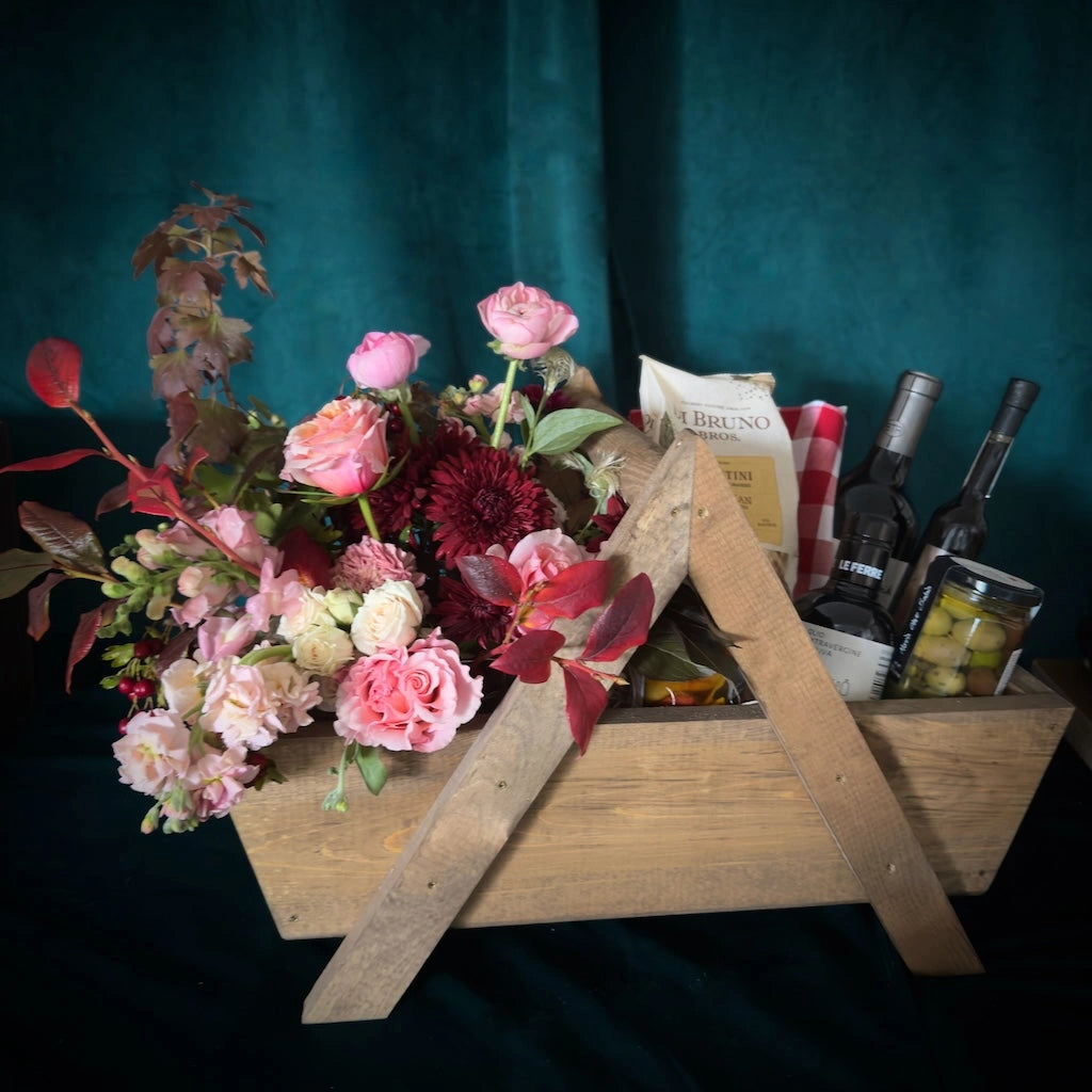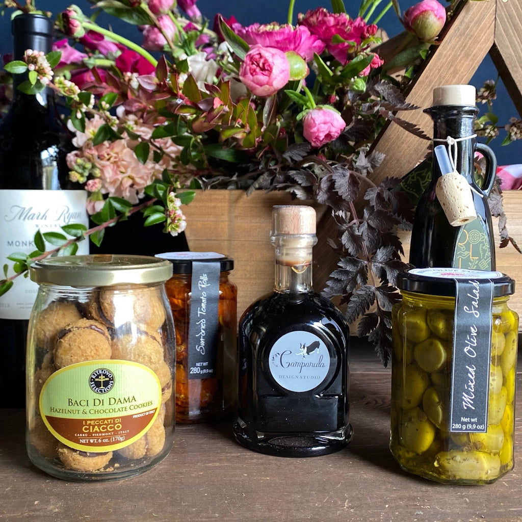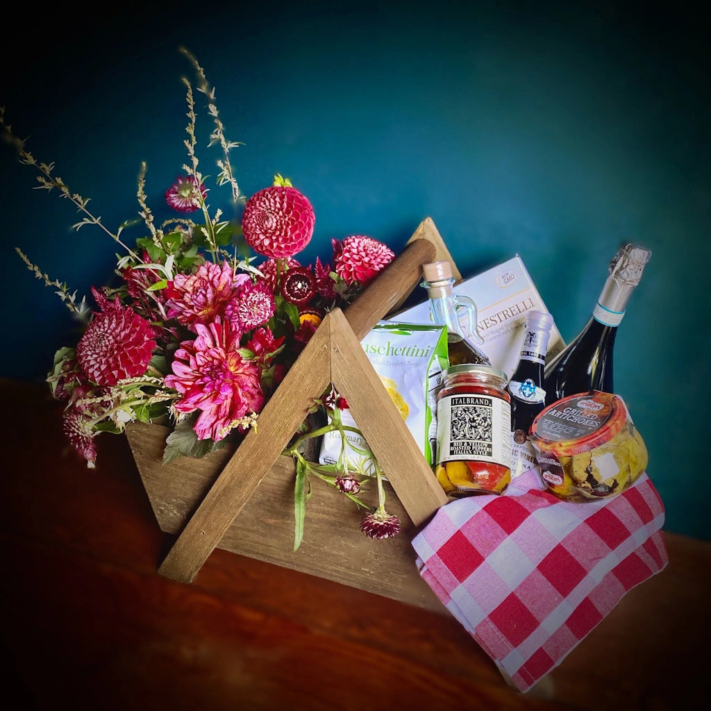 When you can't make it to Italy, bring a taste of the old country to you with this beautiful Italian themed picnic basket. Featuring a lovely monochromatic floral in our signature wooden basket, this one is filled to the brim with Italian delicacies - jars of olives, perhaps some balsamic and olive oil, and something sweet for dessert. Choose from a non-alcoholic sparkling beverage or bottle of wine.