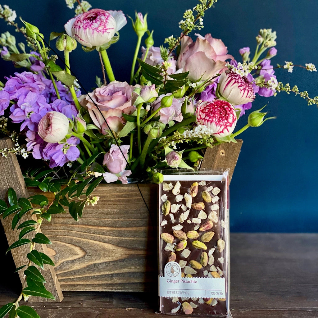Crunchy roasted pistachio and spicy candied ginger adorn rich 70% dark chocolate. Allergy warning: Contains tree nuts and soy.