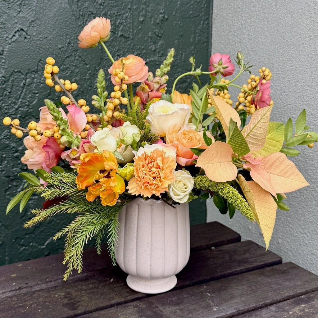 New for the holidays, this warm and earthy arrangement features soft peach, gentle oranges, and creamy whites designed in a footed ceramic pedestal vase. An elegant seasonal moment perfect for a holiday gift or a centerpiece for your table —quiet, inviting, and beautifully understated.