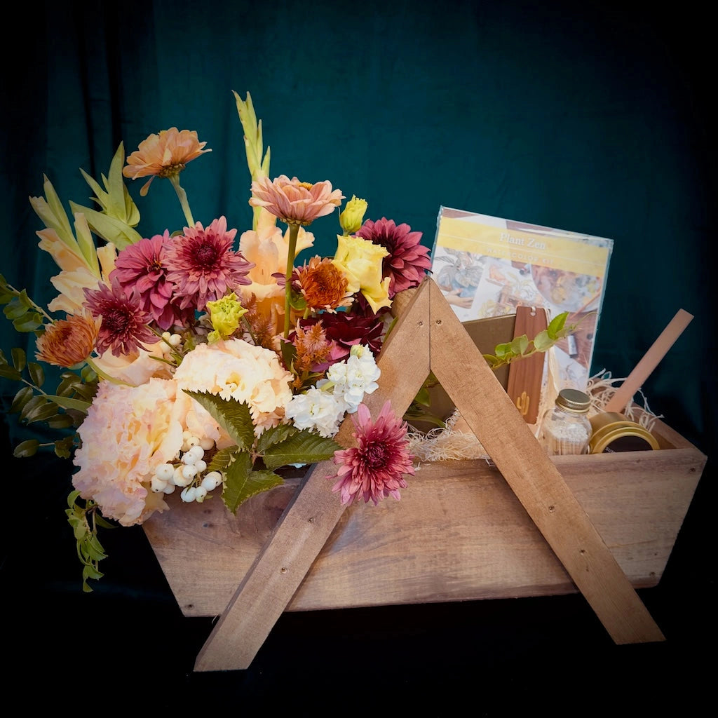Enjoy a moment of peace and tranquility with our 'Zen Garden' signature wooden gift basket. Includes: